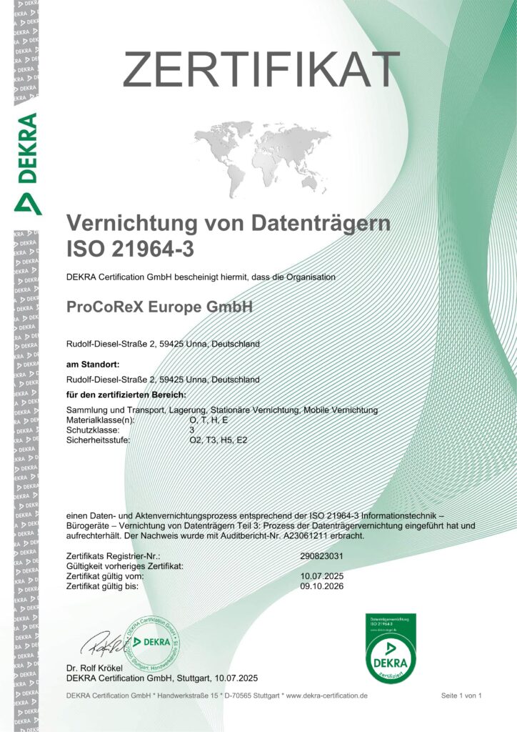 ProCoReX Europe GmbH garantiert eine zertifizierte Vernichtung von Festplatten, SSDs und anderen Datenträgern nach höchsten Sicherheitsstandards. Jeder Schritt wird lückenlos dokumentiert und ist rechtskonform nachweisbar. Maximale Sicherheit: Vernichtung nach Schutzklasse 3 – garantiert DSGVO- und NIS2-konform für höchste Datenschutzanforderungen. So schützt ProCoReX sensible Unternehmensdaten zuverlässig vor Missbrauch und bietet maximale Sicherheit, Transparenz und Compliance bei der Datenträgervernichtung.