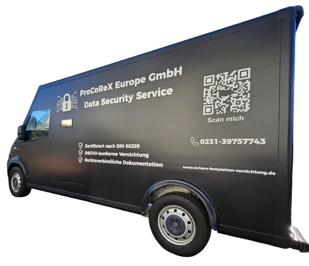 Die ProCoReX Europe GmbH arbeitet mit einem klar strukturierten, mehrstufigen Prozess – von der ersten Anfrage bis zum Zertifikat. Nach individueller Anfrage erhält das Unternehmen ein maßgeschneidertes Angebot und einen abgestimmten Abholtermin. Die Abholung erfolgt durch geschulte Mitarbeitende, auf Wunsch mit unserem gepanzertem B2-Geld- und Werttransporter. Alle Übergaben und Transporte werden protokolliert, die Annahme kann ausschließlich gegen Legitimation und an autorisierte Personen erfolgen. Im Anschluss werden sämtliche Datenträger nach ISO 21964 (ehemals DIN 66399) mechanisch vernichtet und die Geräte recycelt. Jeder Schritt ist lückenlos dokumentiert; Sie erhalten ein offizielles Vernichtungszertifikat sowie vollständige Protokolle.