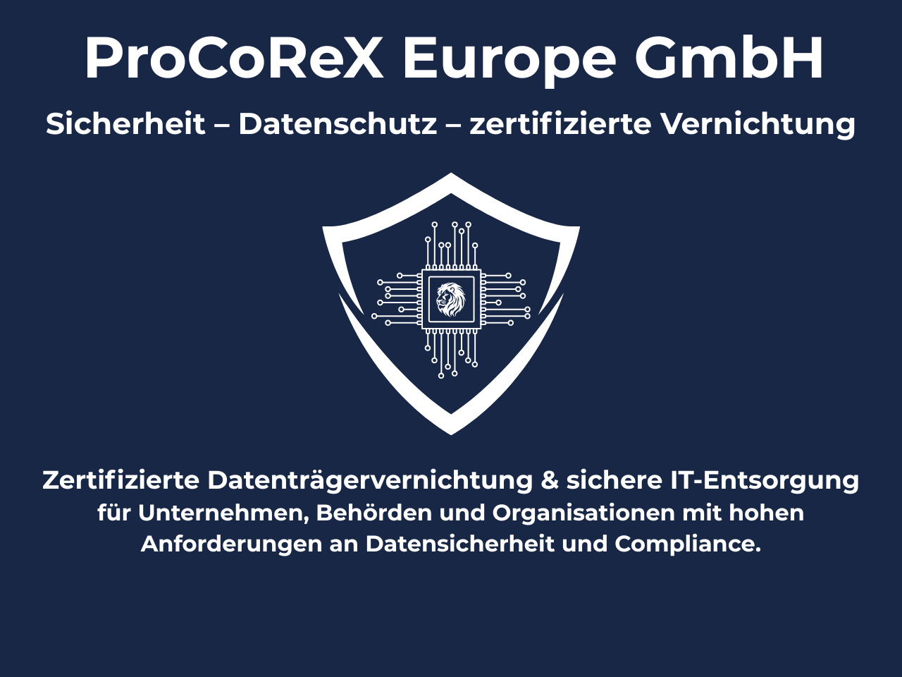 ProCoReX Europe GmbH garantiert eine ISO-zertifizierte Vernichtung von Festplatten, SSDs und weiteren Datenträgern nach risikofreie Sicherheitsstandards. Jeder Schritt wird lückenlos dokumentiert und ist rechtskonform nachweisbar. Maximale Sicherheit: Vernichtung nach Schutzklasse 3 – garantiert DSGVO- und NIS2-konform für höchste Datenschutzanforderungen. So schützt ProCoReX sensible Unternehmensdaten zuverlässig vor Missbrauch und bietet maximale Sicherheit, Transparenz und Compliance bei der Festplattenvernichtung in Stuttgart.