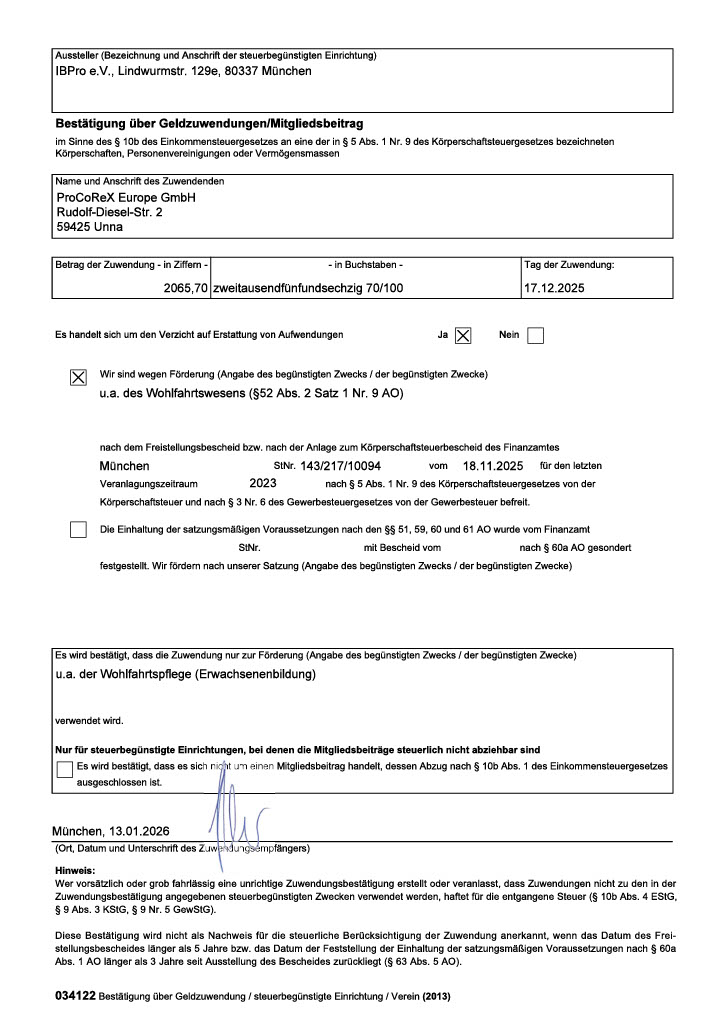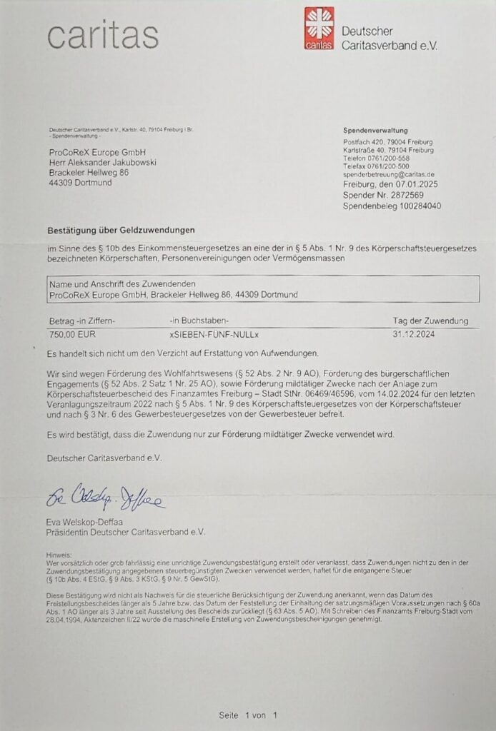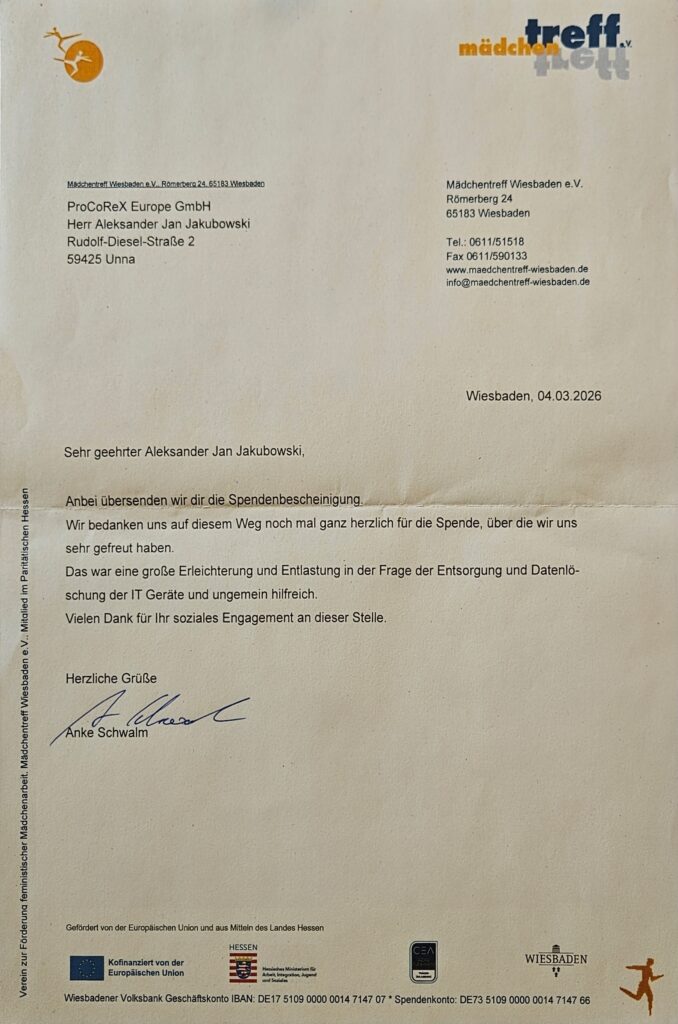 ProCoReX Europe GmbH engagiert sich aktiv durch regelmäßige Spenden an soziale Projekte und Organisationen wie beispielsweise die Caritas oder vergleichbare Einrichtungen. Mit diesem Engagement unterstützen wir gezielt Menschen in Not und tragen zur Verbesserung ihrer Lebenssituation bei. Wichtig ist uns dabei, mit Partnerorganisationen zusammenzuarbeiten, die nah an den Menschen sind und genau wissen, wo Hilfe am dringendsten benötigt wird. So verbinden wir professionelle IT‑Entsorgung mit gelebter sozialer Verantwortung und nachhaltiger Hilfe.