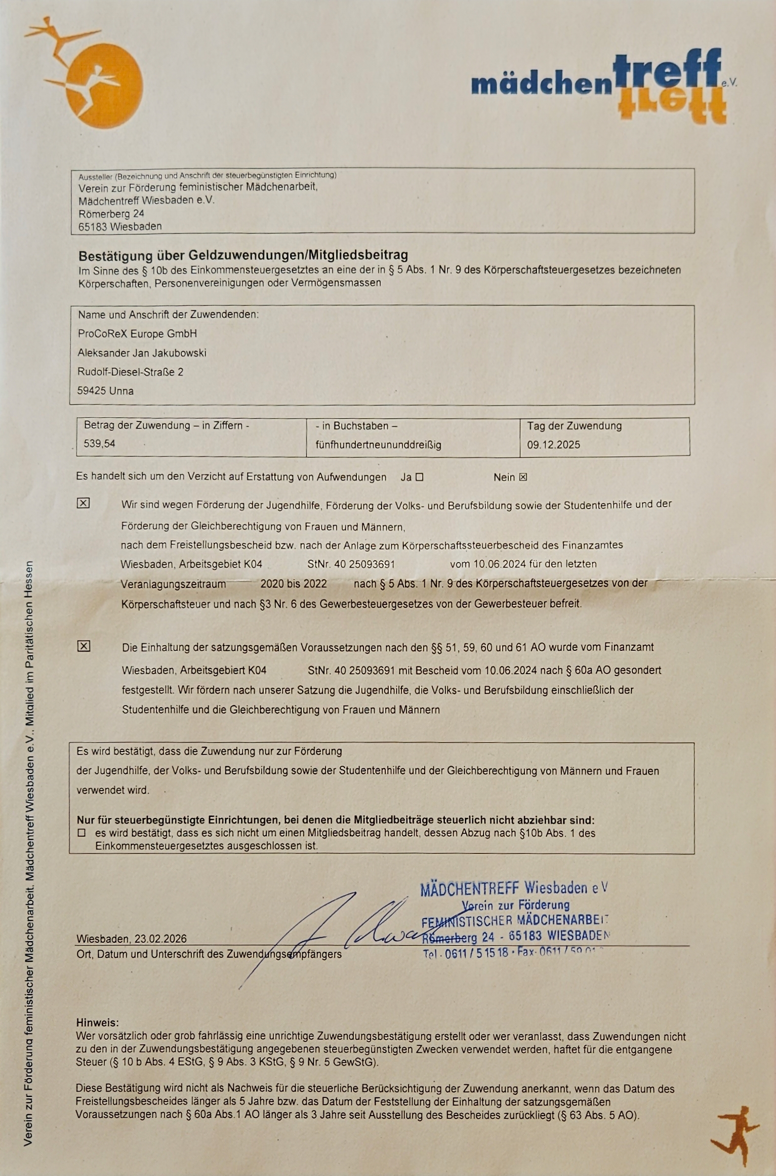 ProCoReX Europe GmbH zeigt mit kontinuierlichen Spenden und Unterstützungsleistungen, wie soziales und ökologisches Engagement zusammenwirken können. Unser Geschäftsführer Jan Aleksander Jakubowski führt die Tradition freiwilliger Spenden fort, die er bereits als Einzelunternehmer begonnen hat. Gemeinsam mit Partnerinnen, Partnern, Kundinnen und Kunden leisten wir einen Beitrag, der Menschen in Not unterstützt und Lebensqualität verbessert. Dieses Engagement steht für eine nachhaltige und solidarische Zukunft, in der Verantwortung für Mensch und Umwelt gleichermaßen gelebt wird.